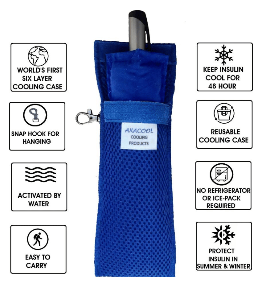 The Axacool insulin cooling case operates without the need for external cooling or electricity. This means there is no requirement to store it in a refrigerator or use chilled ice packs.Â
